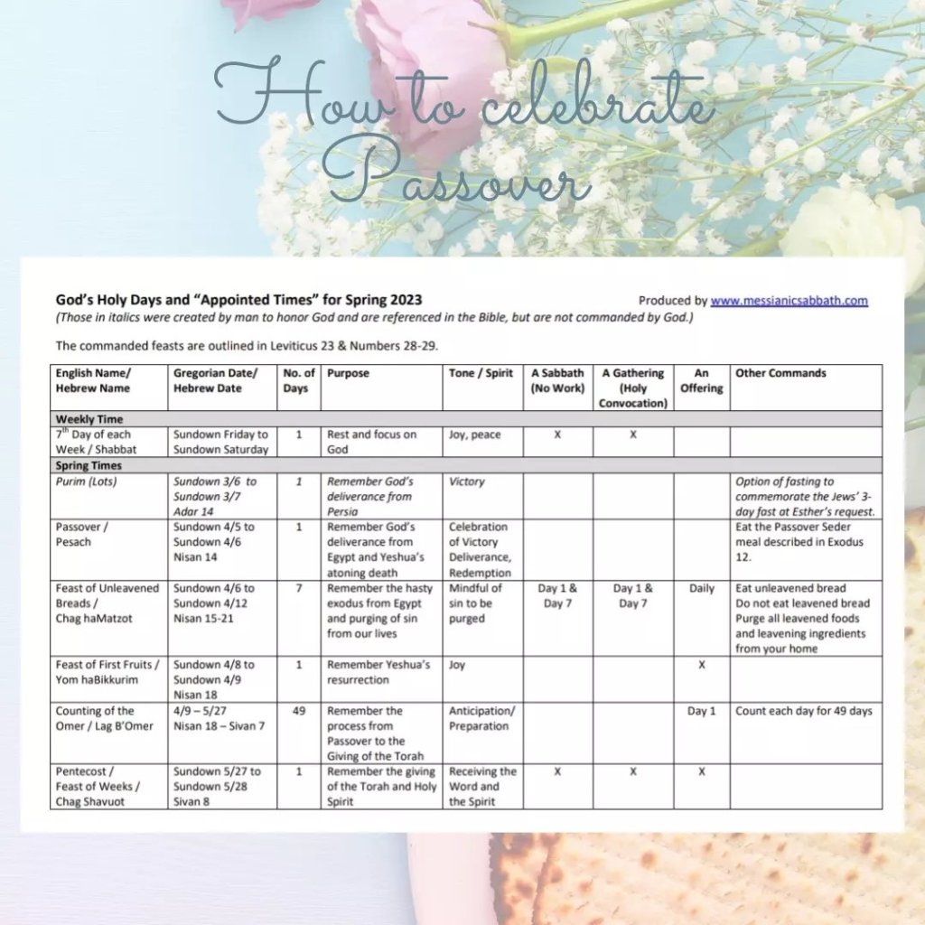 Also important to note that the day of Passover you also start eating unleavened bread and prior to this day you would have already started to give away or put away the leaven bread or any rising agents used for cooking from your house. It’s understandable that we may stay in a household where not everyone celebrates the feasts, but then go as the Lord leads you. Try your best, maybe just your room as a start. I have also heard of brothers and sisters storing some of these leavened goods in their cars.