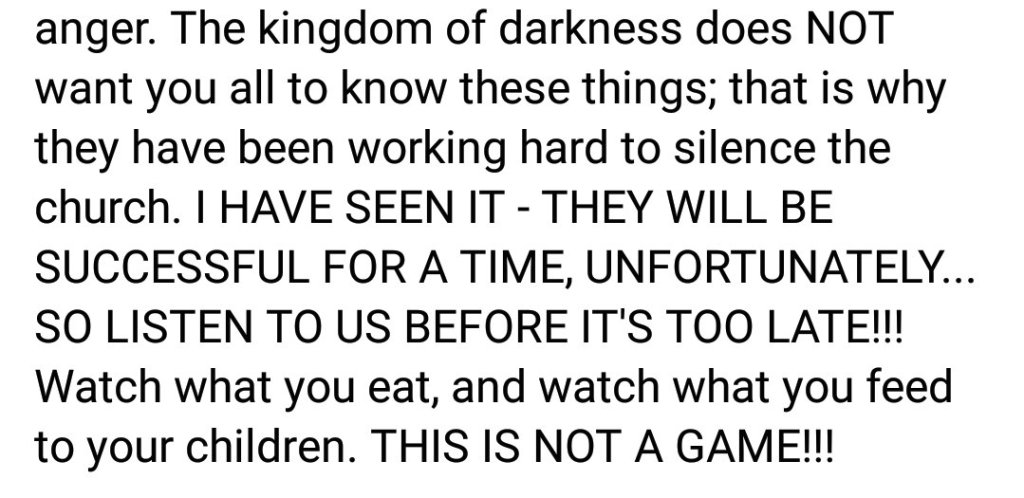 The Book of Genesis explains how mankind was deceived through what he consumed and it may very well be that the enemy is using the same tactics – that’s why we should pay attention to what we are eating and what we consume. Also the fact that this is part of Yahweh’s end time warnings to not one – but two of the seven churches ; means that its the saints of God that need to particularly be mindful of this.
