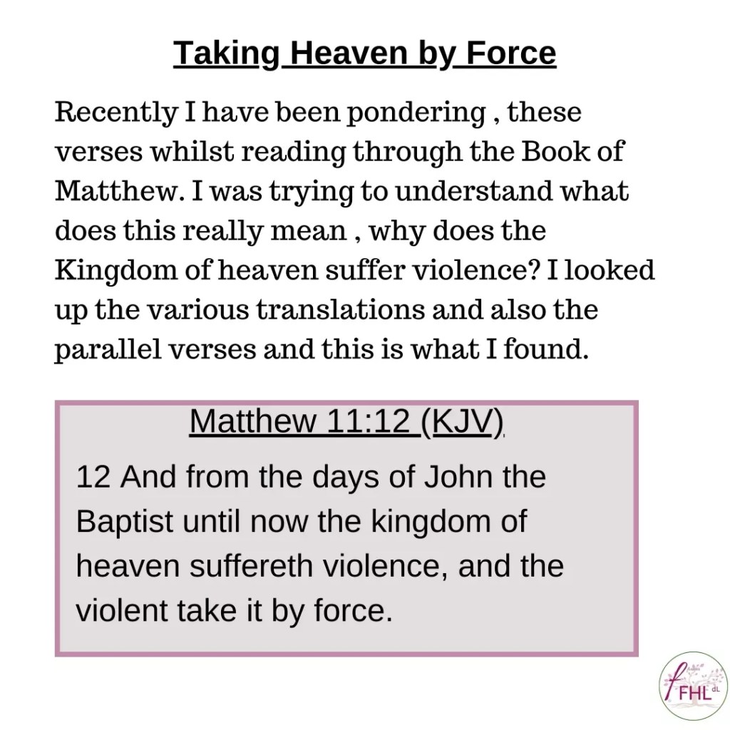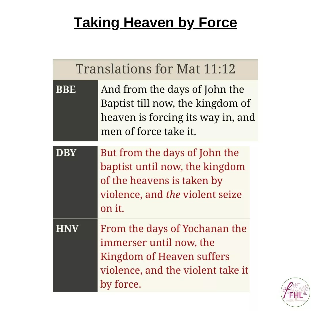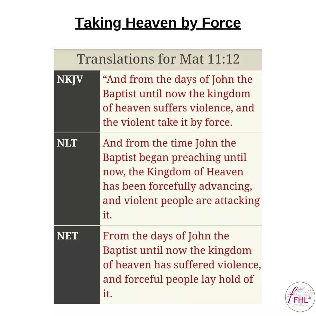 Matthew 11:12 (KJV) ~ And from the days of John the Baptist until now the kingdom of heaven suffereth violence, and the violent take it by force.