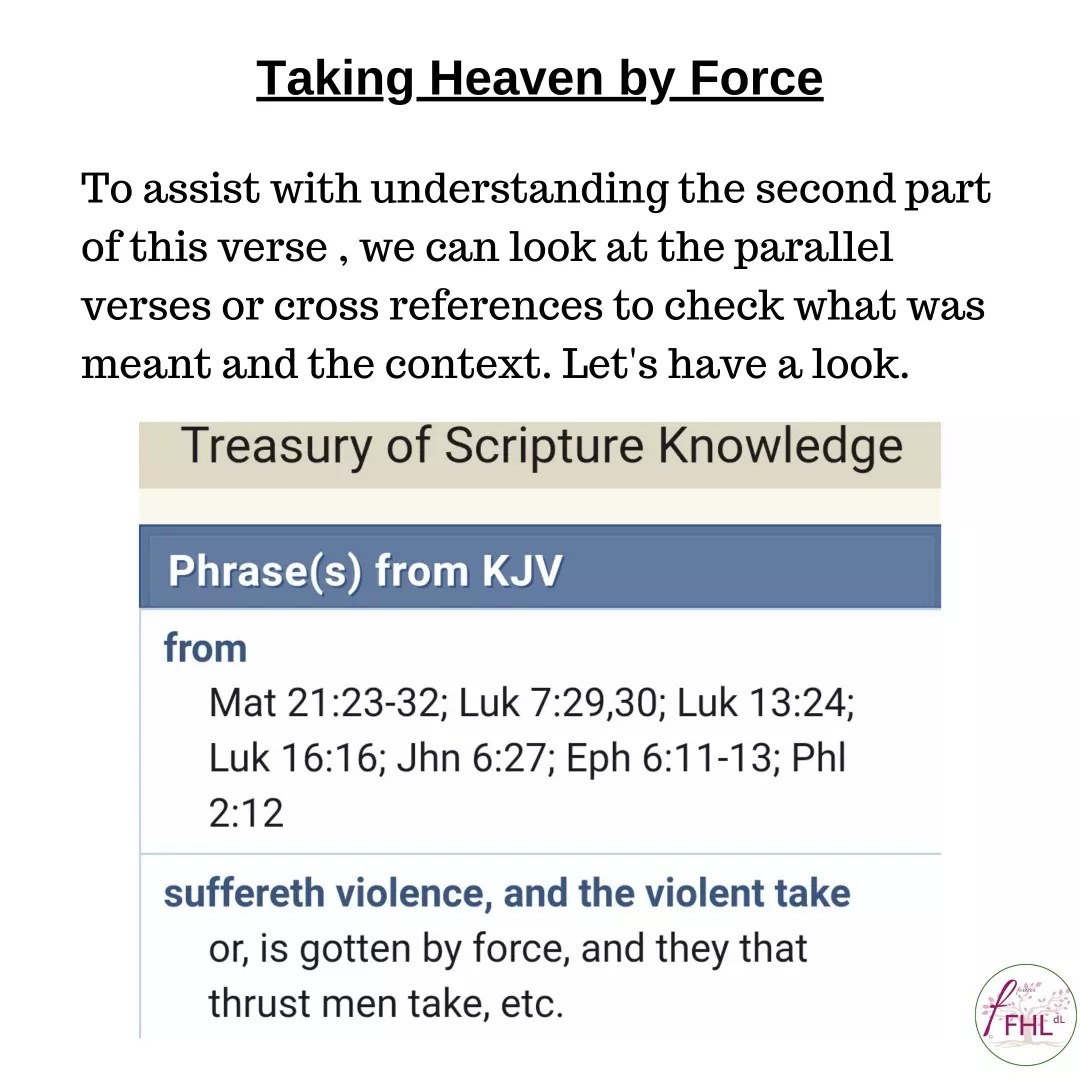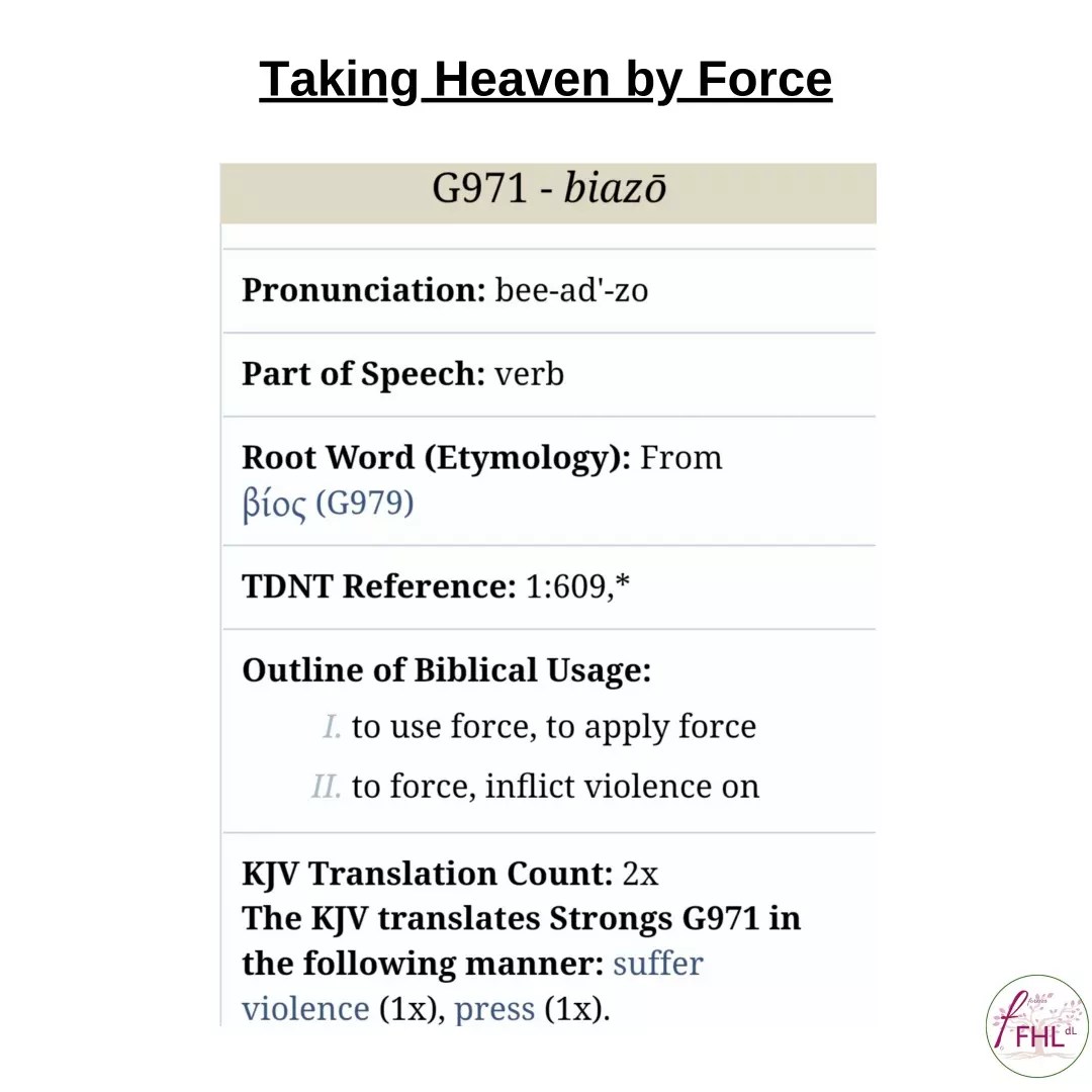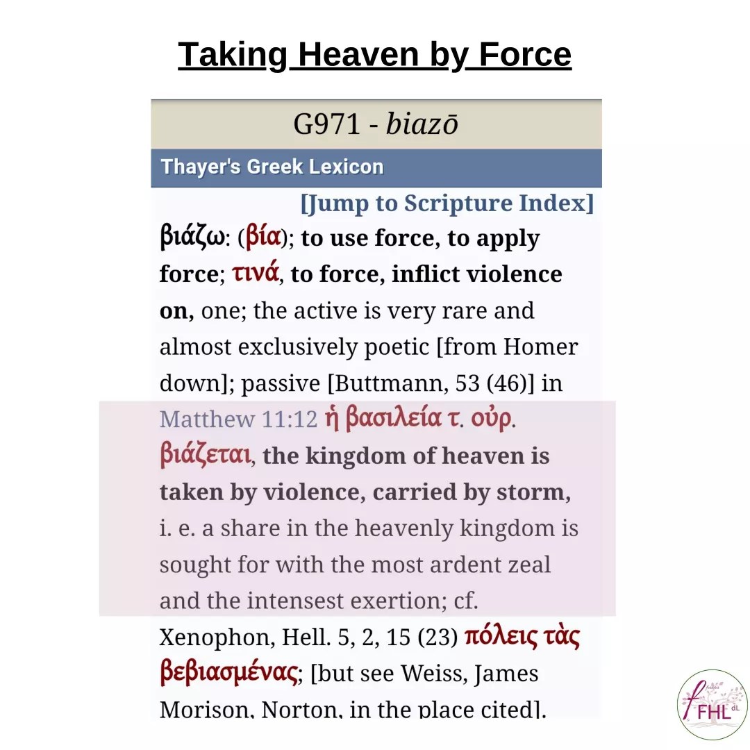 The post above goes into the strongs concordance meaning of the word “biazo” which is suffereth violence. I have also looked into the cross references to assist with the context of how it is used.