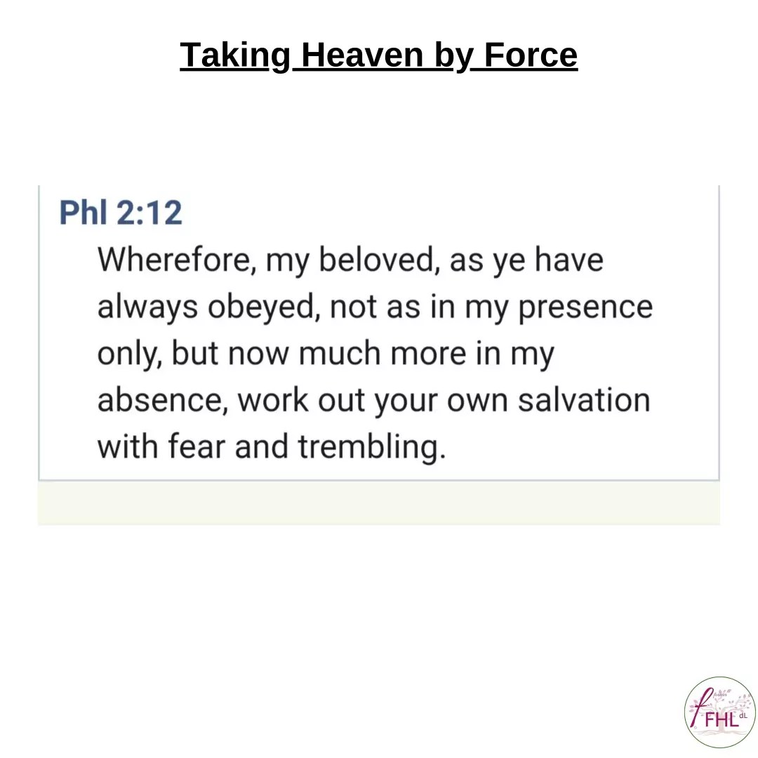 What this verse in essense is telling us is that those who work out their salvation with fear and trembling, those who fight for their faith, fight to make it, will make it and seize and take hold of heaven. This shows us it is indeed a narrow path, and we have to be willing to FIGHT to make it to our Lord Jesus Christ. This is a test to see if we really love Him. Are we growing daily in Christ? This is a stern reminder to me too. I don’t believe Lord Jesus Christ would be pleased if we are not growing in new levels in Him and through Him working in us.